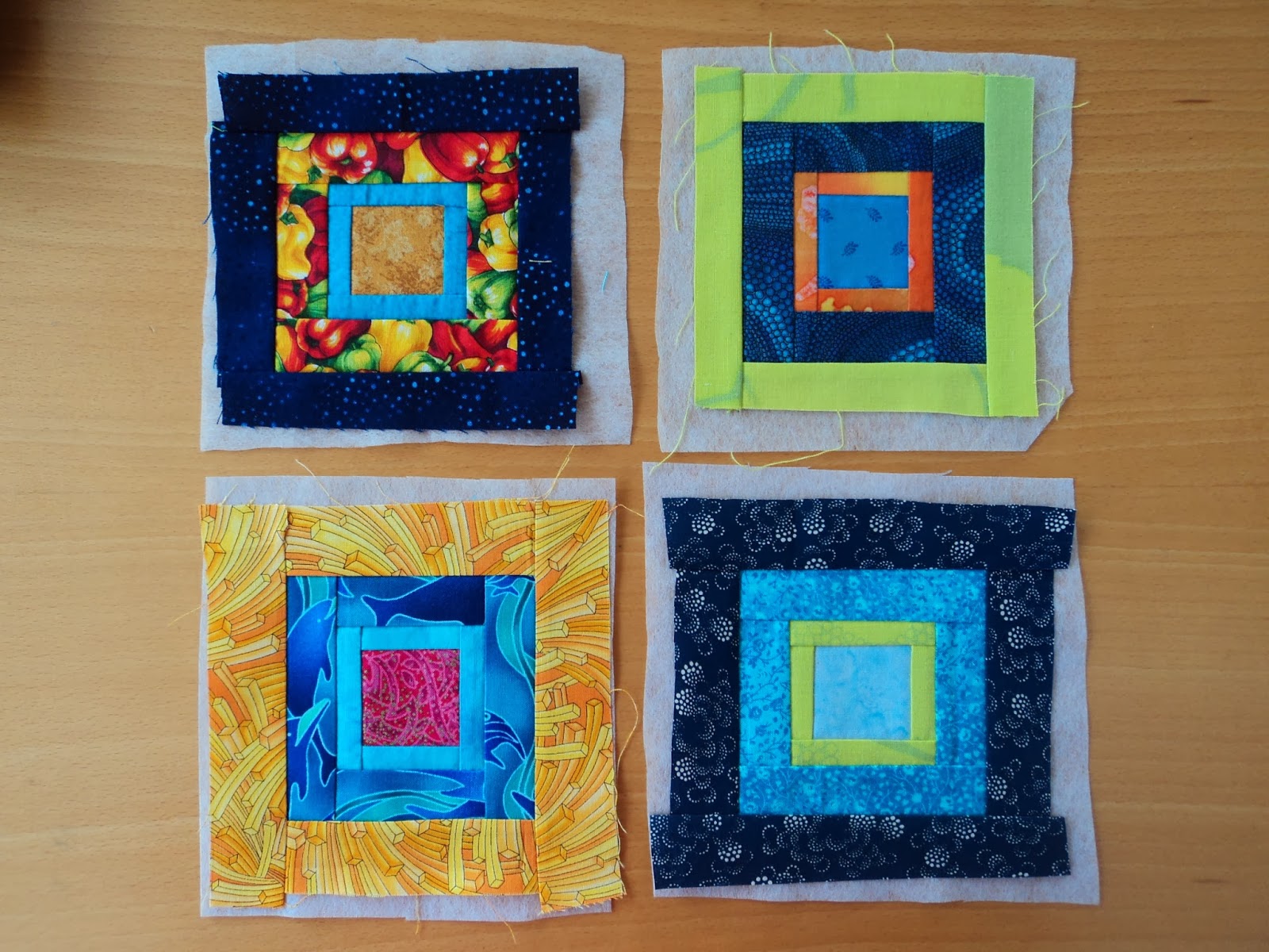 Zoals ik vorige week al heb aangekondigd is het nu weer tijd voor iets anders. Ik heb mijn mini album aan de kant gelegd en heb mijn blauwe logcabin quilt weer opgezocht. Zoals altijd wegen de laatste loodjes het zwaarst maar het eind komt in zicht. Vandaag heb ik weer 4 blokken gemaakt van 10 cm in het vierkant. In het totaal moeten er nu nog 13 blokken van dit formaat genaaid worden en dat wil ik eigenlijk deze week afronden. Onvoorziene omstandigheden natuurlijk daargelaten. Dit zijn de blokken van vandaag.